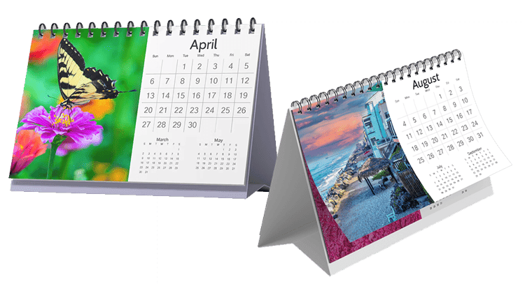 Our custom desk calendars are available in 8.5” x 5.5” and 10” x 4.5". When designing your calendar on our website, you can select your preferred size.