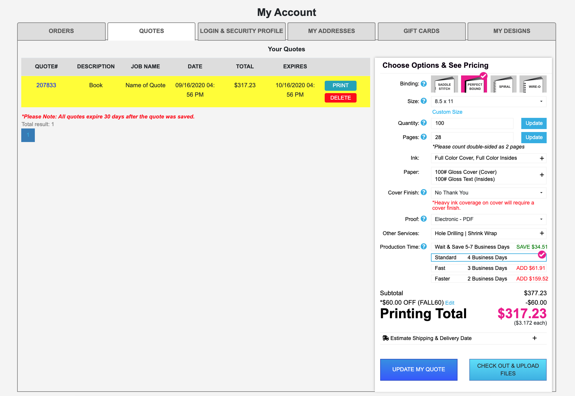 Please note that all quotes will expire in 30 days from the date the quote was made. Promo codes will not be saved with your quote.