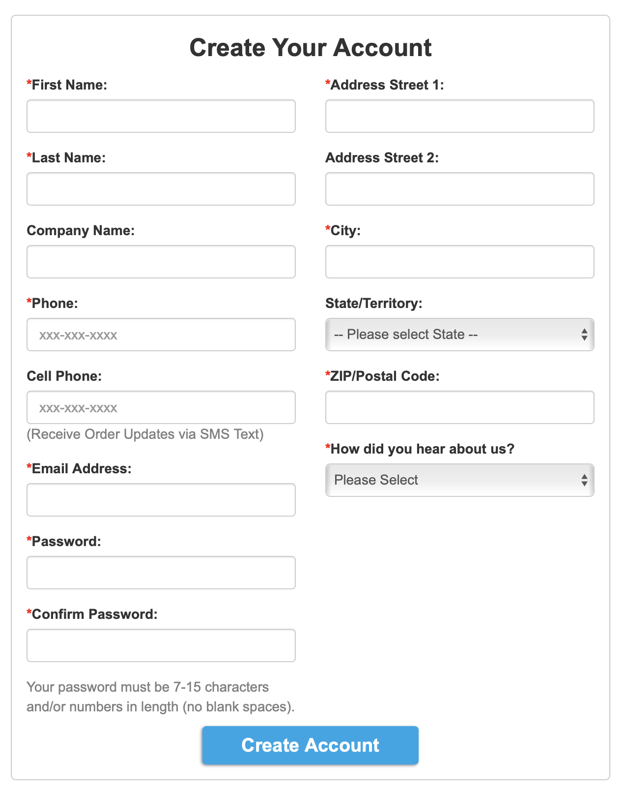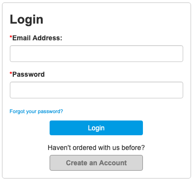 To create an account on the PrintingCenterUSA website, simply click “login” at the top right of the screen. You will then be taken to a form (pictured below) where you will enter your account information and “Create Account.” You will then be taken to your My Account page.