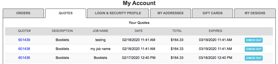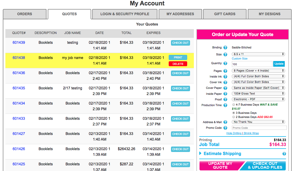 Select the quote you’d like to view. You will have the option to print, delete, and update your quote. If you are ready to proceed with your order, you can select “Check out & Upload Files.” If your quote has expired, then you can select “Update Quote.” Your previously quoted price may change.