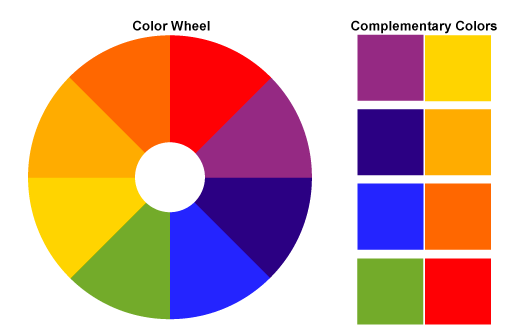 A complementary color is a color that is on the exact opposite side of the color wheel. When complementary colors are placed next to each other, they appear to “pop.” The sets of standard complementary colors are: Blue-Orange, Red-Green, and Yellow-Purple.